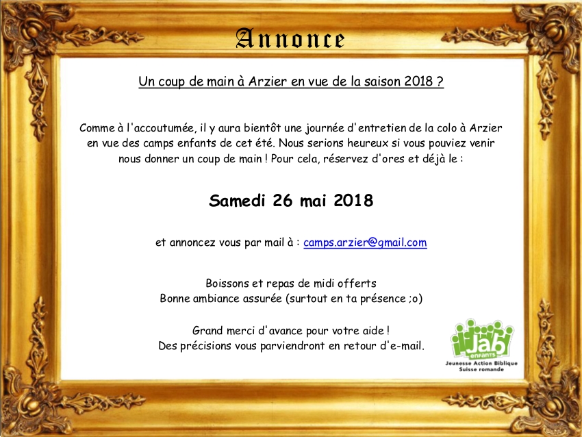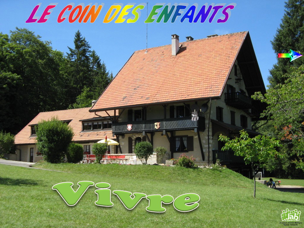¨VIVRE¨ : c’est le nom de la colonie où se déroulent les camps d’été pour les enfants de 7 à 12 ans. Etablie à 900 mètres d’altitude, juste à la sortie d’Arzier (VD) sur la route de St-Cergue, la propriété offre une magnifique vue sur le Mont-Blanc. Elle met à disposition différents terrains de jeux (foot, badminton, basket…), une piscine, une salle polyvalente, un coin bibliothèque, etc. Chaque enfant a de quoi s’amuser en toute sécurité. Au programme des séjours, tout ce que les enfants aiment : sport, jeux, bricolages, baignades et autres découvertes… dont celle, chaque matin, d’une histoire de la Bible. |